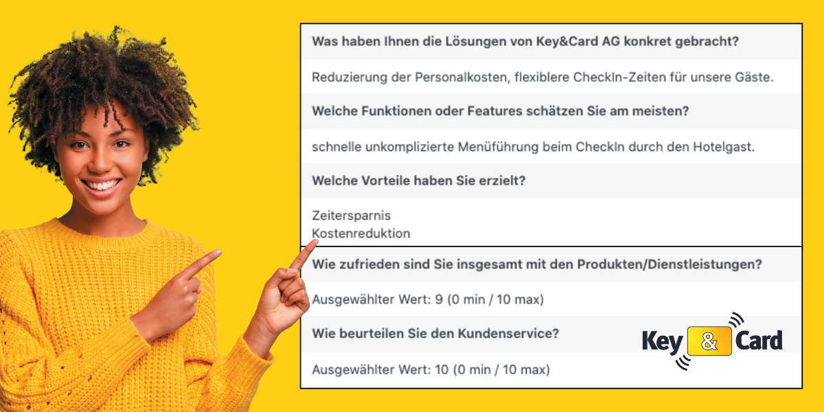 Mit dem Einsatz des Terminals konnte Hotel Am Klostergarten die Personalkosten deutlich reduzieren. Gleichzeitig profitieren die Gäste von flexibleren Check-in-Zeiten. Weitere Merkmale, die besonders geschätzt werden, sind die schnelle und unkomplizierte Menüführung beim Check-in durch die Hotelgäste, die Zeitersparnis sowie die Kostenreduktion. Der Service von Key&Card AG wird mit der Höchstnote bewertet.